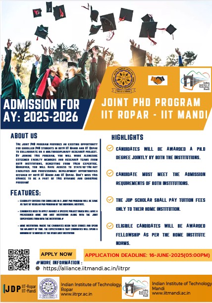 We are delighted to introduce the PhD Joint Degree Program (JDP) that brings together the esteemed institutions of IIT Mandi and IIT Ropar. This collaborative PhD program offers a unique opportunity for enrolled students to engage in a multidisciplinary research project. By joining forces with faculty members and research teams from both IIT Mandi and IIT Ropar, participants can leverage the collective expertise and resources of these renowned institutions.